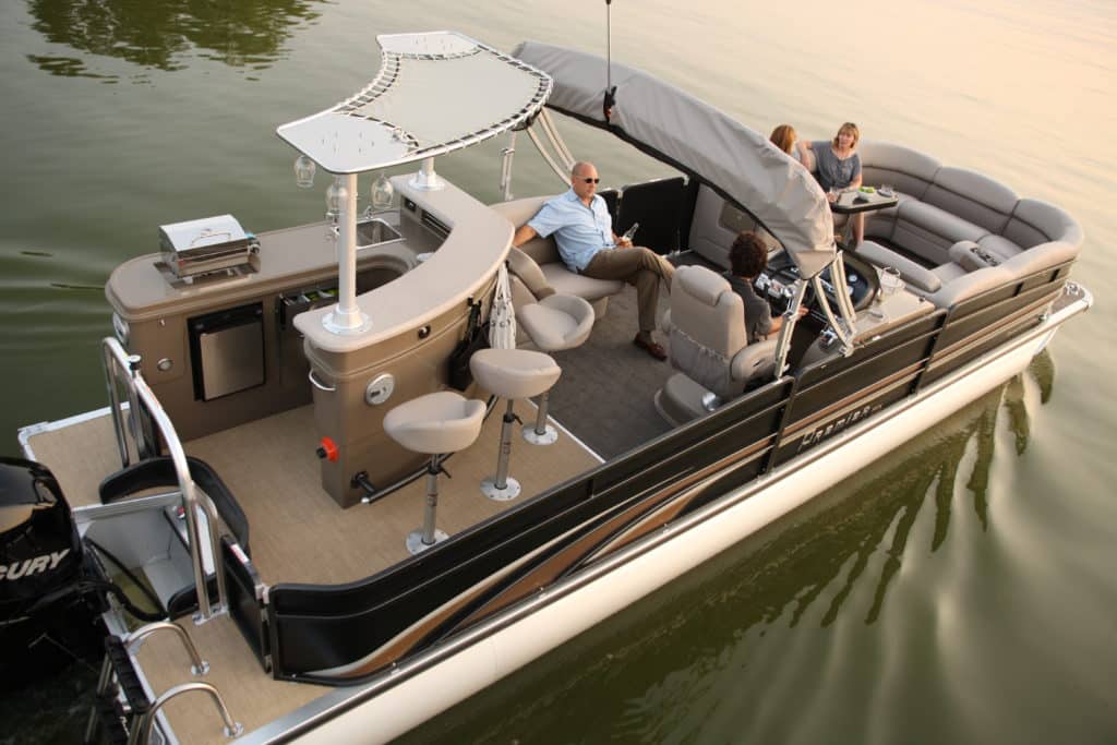 Structural features, such as large footprint M-brackets that connect deck to the pontoons, solid aluminum keels and an equally solid all-aluminum framework, indicate this big ’toon is built for the long haul on big water. Luxury features such as Flexsteel furniture, stainless-steel accents and deck hardware, and special upholstery made with “nano block technology” to make stains easy to clean, ensure a pleasant environment every time you step aboard. Looking to be the skipper of the boat that’s at the center of Saturday’s raft-up? Take Premier’s Grand Entertainer 290 for a trial.