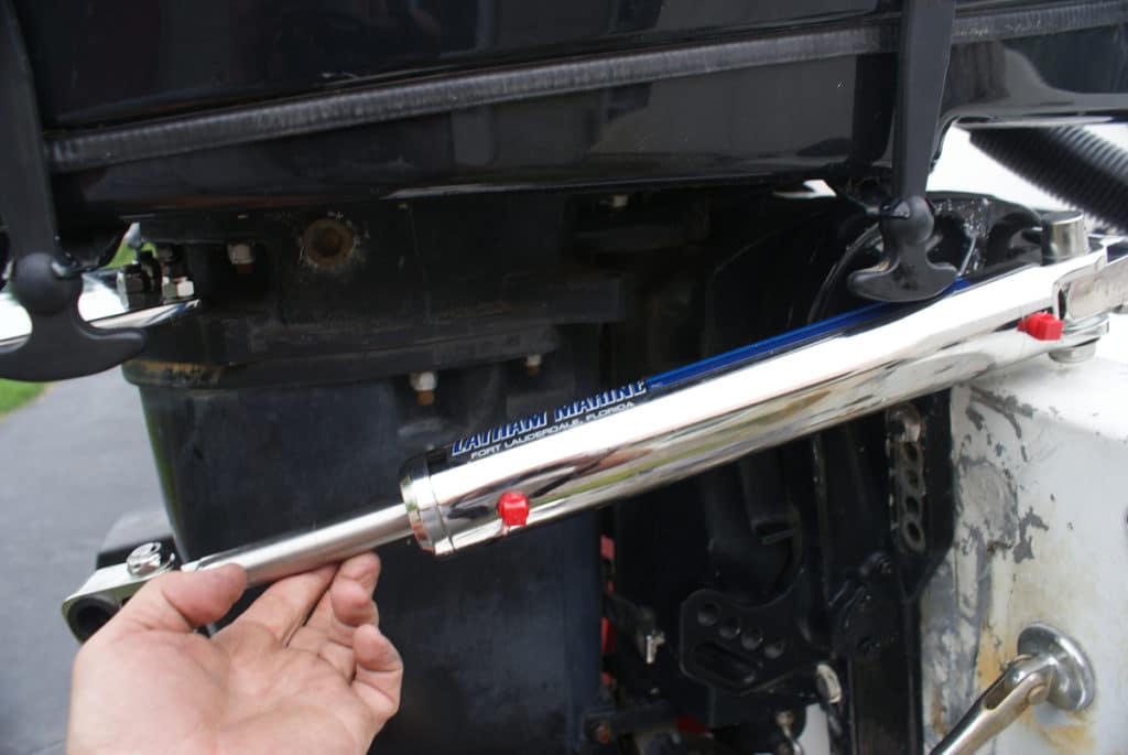 Latham provides all the fittings. I installed the flared fittings on the back of the helm and positioned them so that the hoses can’t be seen beneath the helm. I ran the hoses to the stern of the boat. Next came the side-mount ram tilt pins. For this part of the installation, Latham insists that the motor be supported at two points before removing the stock tilt tube. I used ratchet straps around the base of the powerhead to hold the upper half of the motor forward and a floor jack with a block of wood beneath the skeg to support the lower end. It takes a little trial and error to get the old pin out. This is a two-person job, with one in the boat working the power trim and the other outside working the jack. You’ll know when you’ve got everything in the right position because the old pin pulls out with minimal effort.