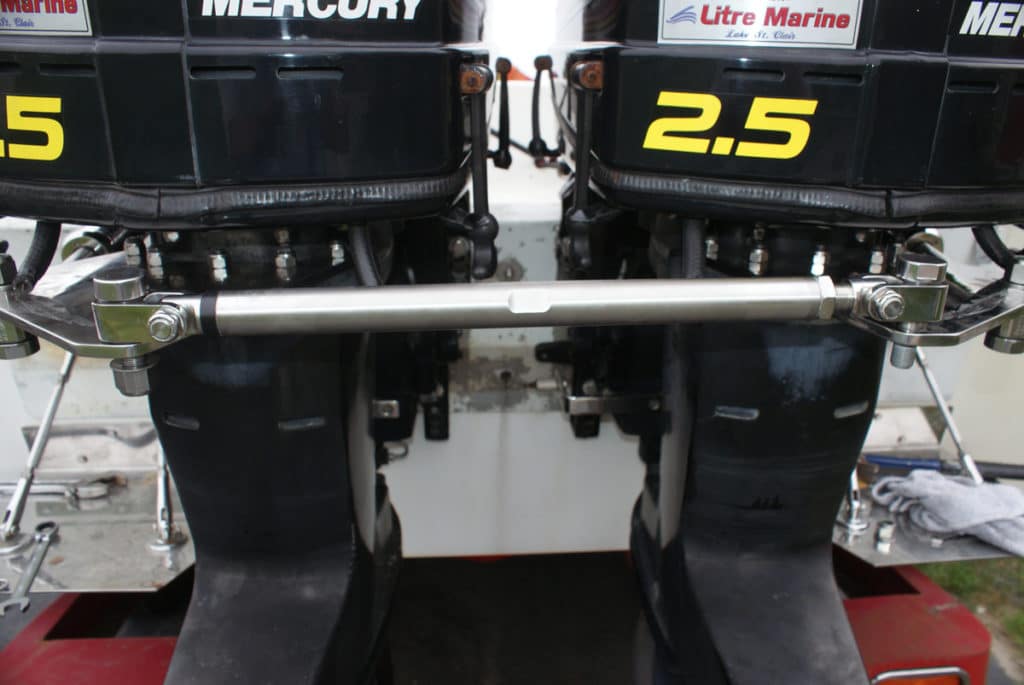 Next it was time for the wing plates that bolt to studs at the rear of the engine’s exhaust adapter plate. Fortunately, my motors already had these studs in place, which saved some time. I installed the half-inch-thick stainless-steel plates to the bolts and tightened the nylon-lined locking nuts. The hydraulic rams can be positioned above or below the plate. Just make sure that there is clearance and that the ram can move freely. Each ram comes with plastic plugs on the outside. Remove these plugs and you can pull out the ram to extend it aft to connect the plate with the hardware that Latham provides. Do the same on the other motor and you’re ready to install the tie bar that links the motors. Before you do so, make sure the motors are centered. The tie bar is adjustable if you need to refine the position.