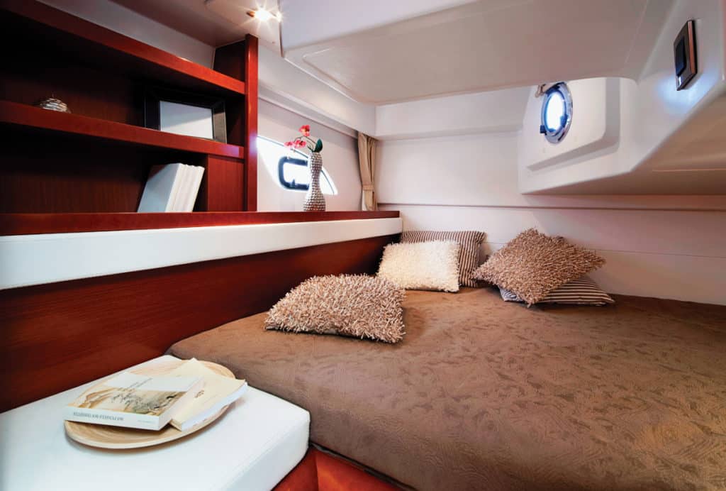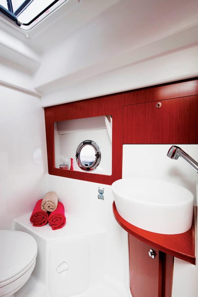 Belowdecks, the master cabin lies athwartships beneath the helm, with a head to port opposite a hanging locker and sink. Forward, the dinette converts to a V-berth. Fit and finish are excellent, with cabinetwork a highlight.