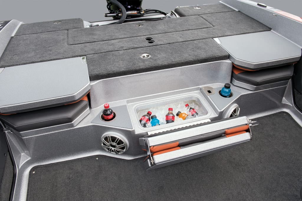 For fishing, flip those three aft seats down and you have an enormous casting deck to match the one at the bow. There’s a fully functioning livewell aft and a combination ski-and-rod locker up front. Keep water skis in the center locker — there is space alongside for rods. The helm offers space for an optional, factory-installed Lowrance GPS/chart-plotter combo and compartments for tackle or phones.