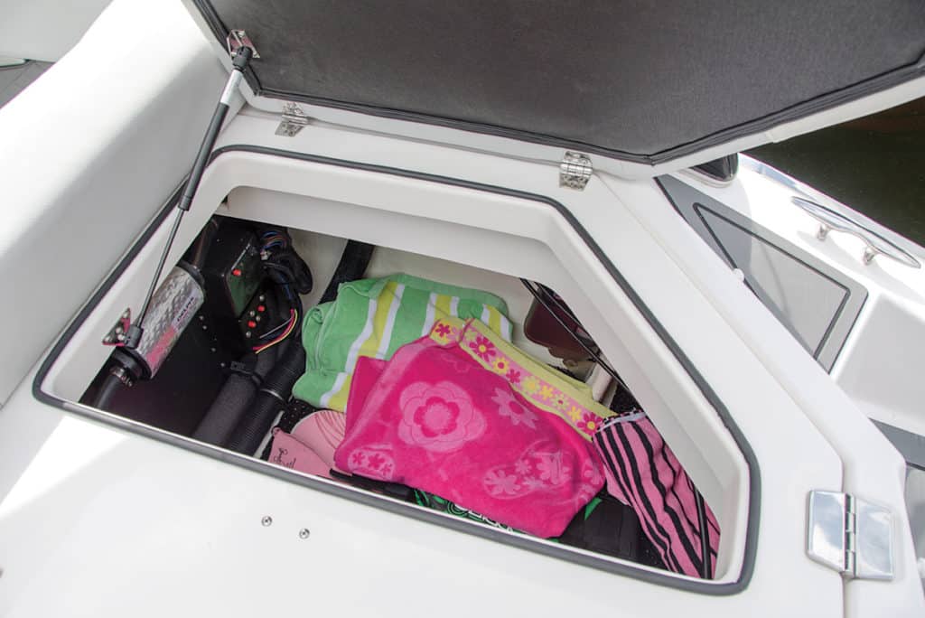 The Surf Edition adds the Forward Drive, the Regal View helm — a touch-screen master command multifunction display — surf tabs and a ballast system. With Regal View, the driver can set the controls and adjust the surf tabs to the rider’s preferences and then set the boat so that it automatically accelerates to the desired speed and makes the boat list to either port or starboard to help sculpt the wake to the rider’s preferred side. Two 80-gallon ballast bags sit under the sun pad to either side of the transom, and a third one fills up the insole locker in the cockpit. They fill with water at the push of a button on the Regal View.